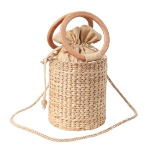 Round Straw Rattan Crossbody Bag with Shoulder Leather Strap