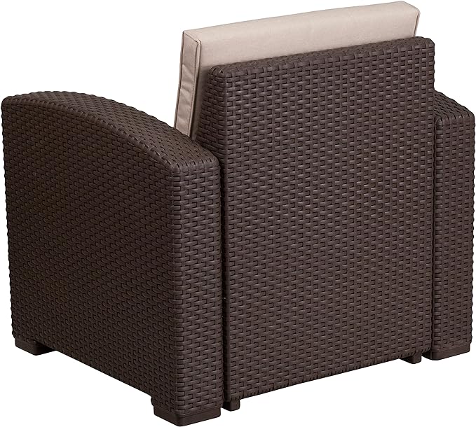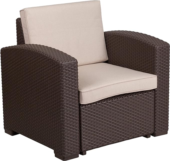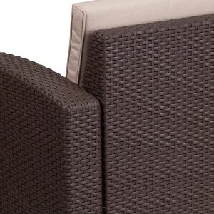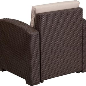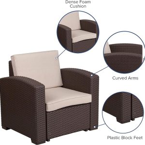 - The durable resin frame offers a stylish appearance which replicates rattan. Deep seating enhances the comfort level. Beige all-weather cushions will hold up all season long. Clean up spills with a water-based cleaner or the cushions are zipper removable for washing purposes when spot cleaning just isn’t enough.