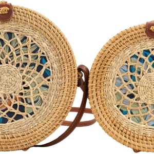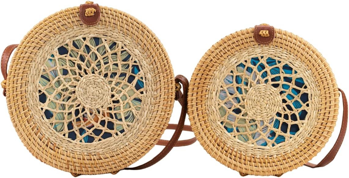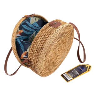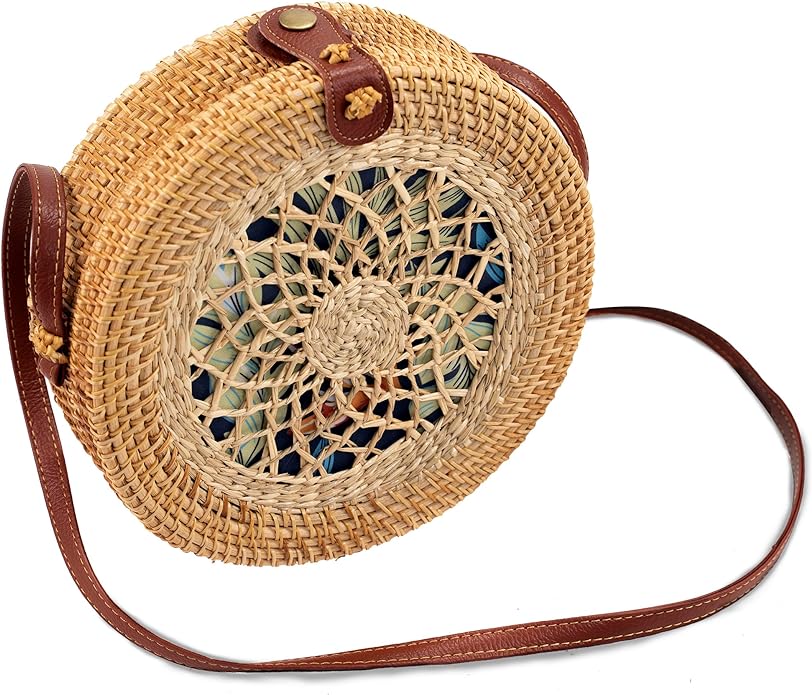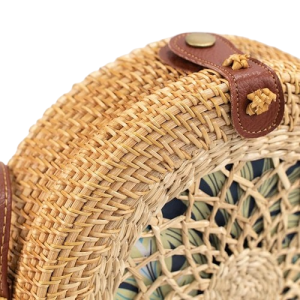 - Circular natural rattan shoulder bag with one small ornamental scarf that is handcrafted. Your everyday activities will be so much more interesting with this summer bag, which will also serve as a year-round fashion piece.